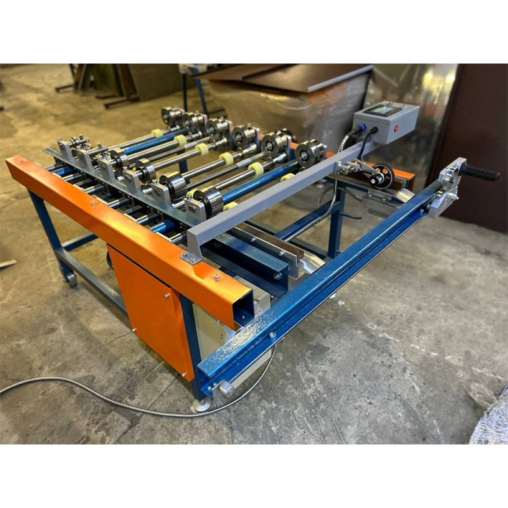 Станок может использоваться как в стандартном варианте комплектации, так и с дополнительными вспомогательными опциями, существенно расширяющими возможности станка и упрощающие работу с ним. Так мы предлагаем использовать к станку напольный разматыватель металла, который благодаря его небольшому размеру и весу можно использовать прямо на месте монтажа кровли, для этого на размотчик ложится рулон металла и подавая его в станок происходит процесс прокатки фальцевых панелей. Одним из вариантов дополнительной комплектации к станку является установка на него датчика длины, который дает возможность прокатывать кровельные панели одинаковой длины в полуавтоматическом режиме, без необходимости разметки панелей вручную с помощью линейки или рулетки, как это было ранее. Таким образом существенно экономится время при работе на станке и увеличивается точность изготавливаемых панелей. В комплекте с датчиком длины в большинстве случаев приобретают также нож для поперечной резки металла, позволяющий после прокатки картины нужной длины отрезать ее от общего рулона металла.